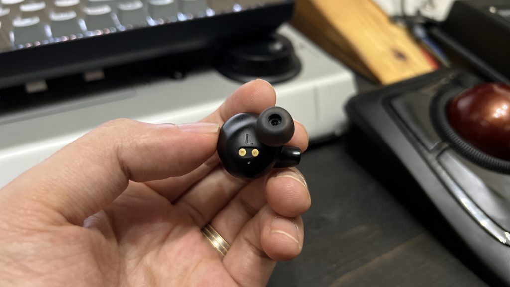 デザインはご覧の通り、”人工工学系”。耳の隙間にフィットするような形状で、近未来的。かなり良い感じです。カナル型ということもあって、ミチっと密閉されたような装着感。頭を振っても外れる気配はありません。若干厚みがあってボテっとした印象。