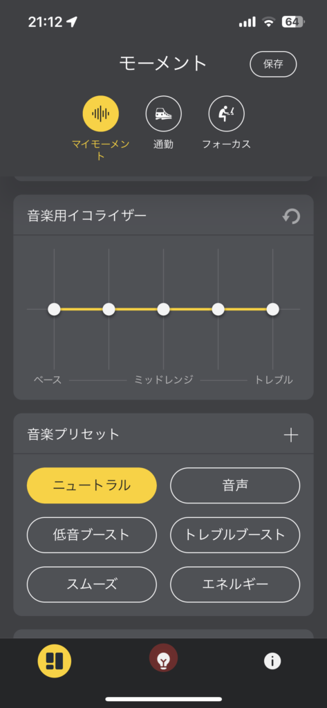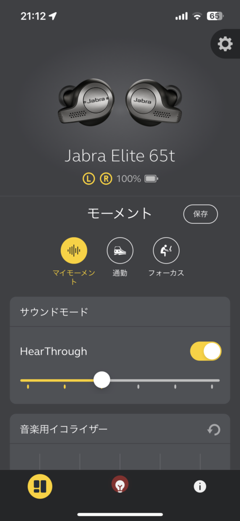 専用のアプリがあって、外音取り込み強度、イコライザー、その他細かな設定ができます。