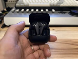 Bluetoothイヤホンで重要になってくるのが、ノイズキャンセリングと外音取り込み。右側イヤホンのボタンを2回タップするとモードが切り替わります。どちらもかなり優秀です。カナル型なので密閉性が良く、ノイズキャンセルすると他の音はほぼ聞こえなくなります。イヤホンを付けたままコンビニに入ったりする時は、2回タップで簡単に外音取り込みモードに。普通に会話できます。