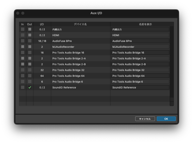インプットとアウトプットで使用するデバイスは通常通りメインデバイスに設定し、ProTools設定タブの[I/O]メニュー内のインプットタブで、これまでにはなかった [Aux I/O] を開きます。